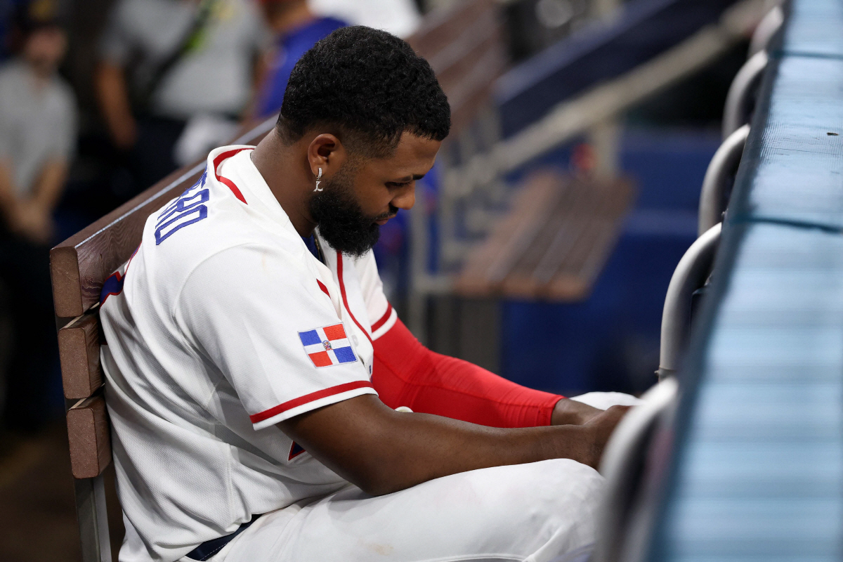 도미니카공화국에 유일한 득점을 안긴 홈런의 주인공 주니어 카미네로가 2026년 WBC 결승 진출에 실패한 뒤 더그아웃에서 아쉬워하고 있다. AFP연합뉴스