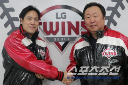 LG 김진성이 2+1년 최대 16억원에 다년계약을 하고 차명석 단장과 기념촬영을 했다. 사진제공=LG 트윈스