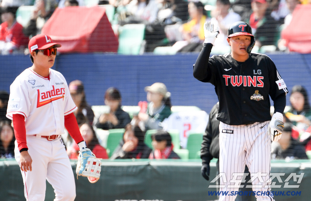 20일 인천SSG랜더스필드에서 열린 SSG 랜더스와 LG 트윈스의 시범경기. 3회초 LG 이재원이 안타를 날린 뒤 기뻐하고 있다. 인천=박재만 기자 pjm@sportschosun.com/2026.03.20/