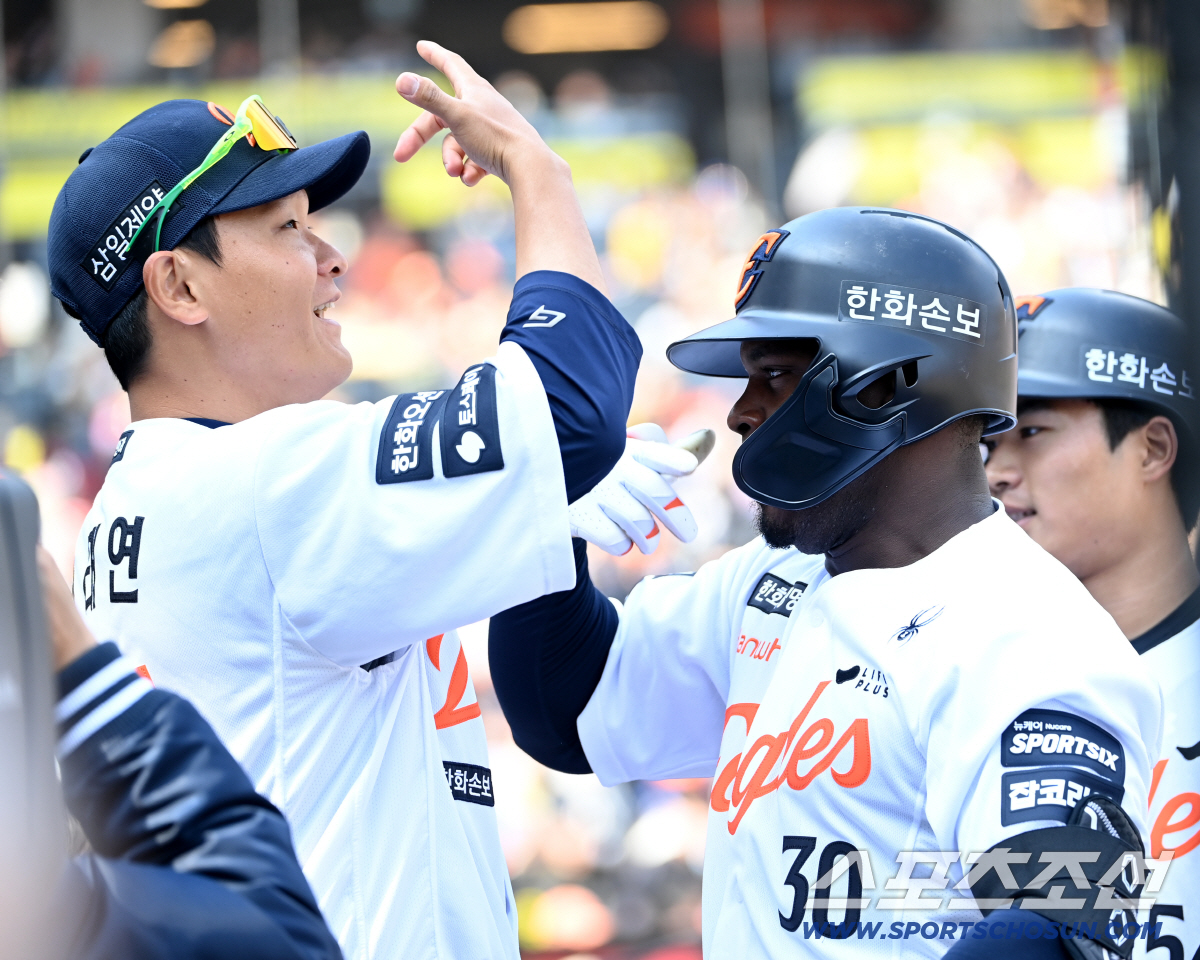 20일 대전한화생명볼파크에서 열린 KIA와 한화의 시범경기, 4회말 무사 1루 한화 페라자가 중월 2점홈런을 치고 김재걸 3루 코치와 기쁨을 나누고 있다. 대전=허상욱 기자wook@sportschosun.com/2026.03.20/