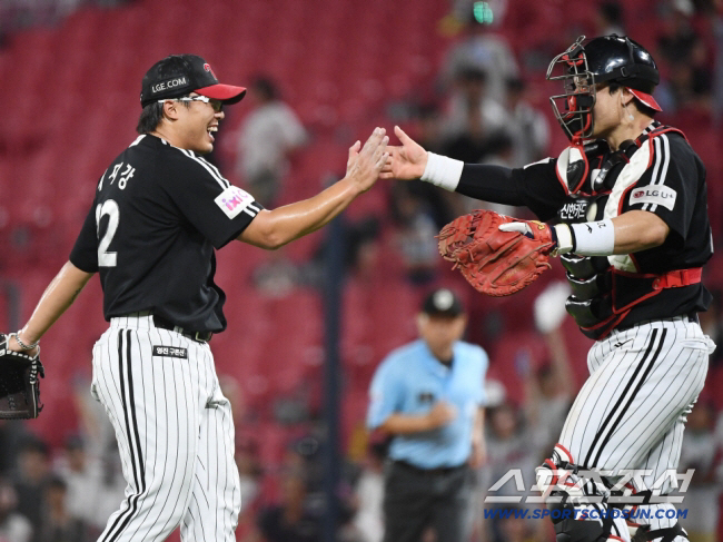 22일 광주 기아 챔피언스필드에서 열린 LG-KIA전. LG가 9대7의 극적인 역전승을 거뒀다. 이지강이 박동원과 하이파이브하고 있다. 광주=정재근 기자 cjg@sportschosun.com/2025.7.22/