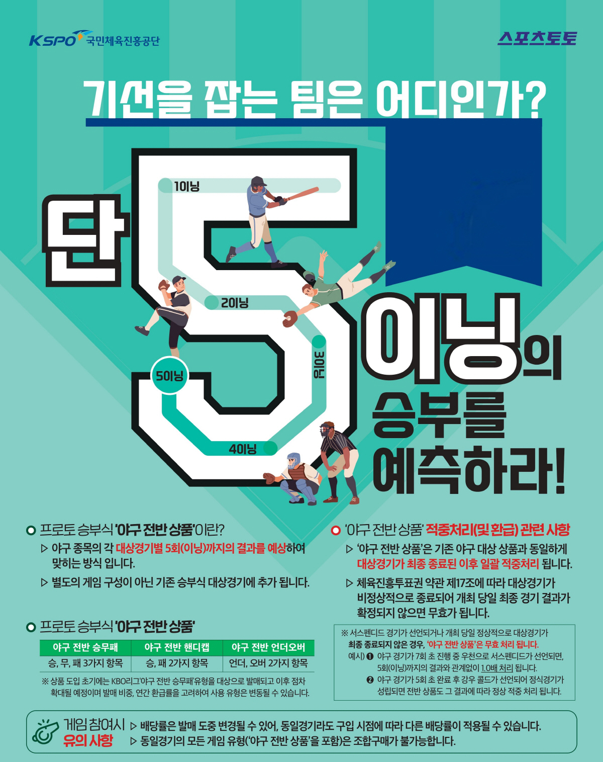 한국스포츠레저㈜ 관계자는 "KBO리그 개막과 함께 야구에 대한 관심이 높아지는 시기인 만큼, 초반 승부에 집중해야 하는 전반 상품에 대한 스포츠팬들의 관심도 동시에 높아질 것으로 기대된다"며 "앞으로도 다양한 게임 유형을 통해 고객 선택의 폭을 지속적으로 확대해 나갈 계획"이라고 밝혔다.