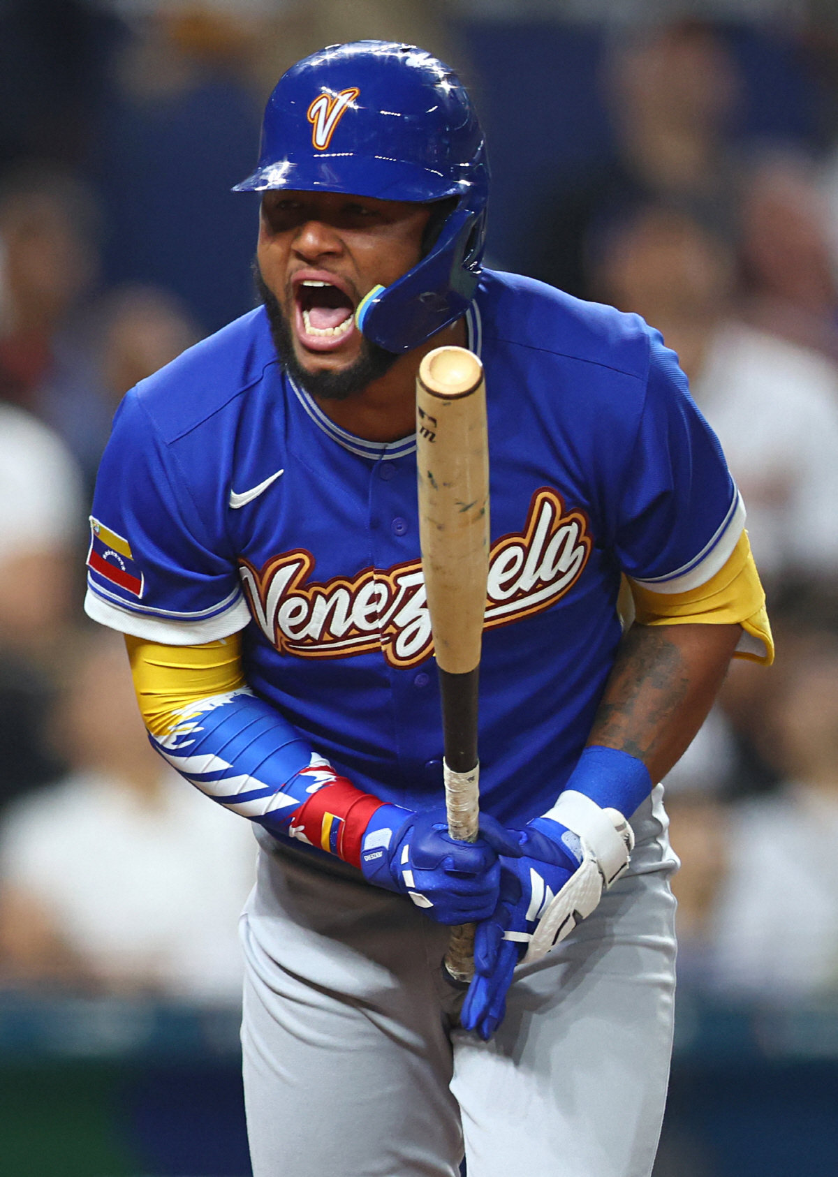 Mar 17, 2026; Miami, FL, United States; Venezuela center fielder Jackson Chourio (1) reacts after defeating the United States during the 2026 World Baseball Classic Championship game at loanDepot Park. Mandatory Credit: Sam Navarro-Imagn Images