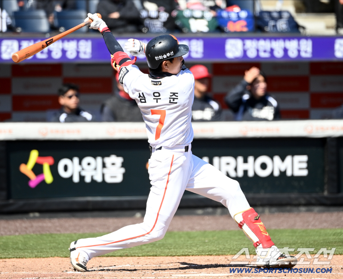 | 19일 대전한화생명볼파크에서 열린 KIA와 한화의 시범경기. 3회말 무사 1루 한화 심우준이 2루타를 치고 있다. 대전=허상욱 기자wook@sportschosun.com/2026.03.19/ |