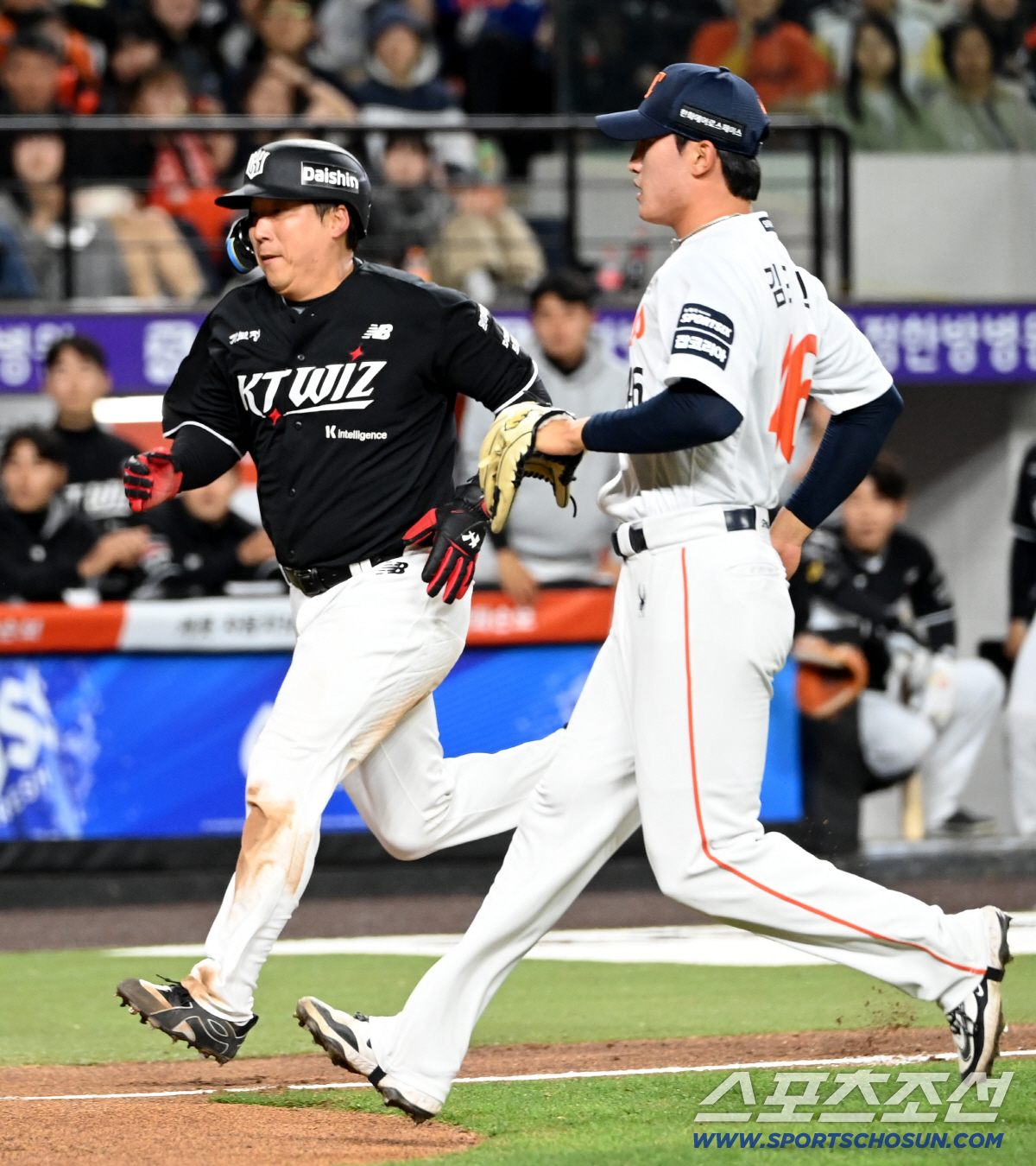 31일 대전한화생명볼파크에서 열린 KT와 한화의 경기. 7회초 2사 2,3루 KT 힐리어드 타석때 3루주자 김현수가 한화 김도빈의 폭투에 홈을 밟고 있다. 대전=허상욱 기자wook@sportschosun.com/2026.03.31/