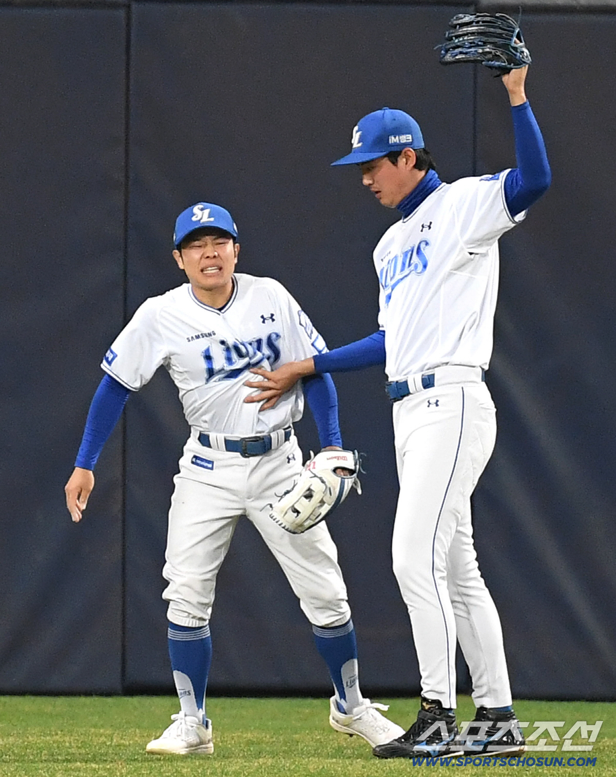 김지찬은 펜스에 무릎을 부딪혀 고통을 호소했다. 그러면서도 끝까지 공은 놓치지 않았다. 당연히 2타점인줄 알았던 양석환은 어이없다는 듯 김지찬쪽만 쳐다봤다.