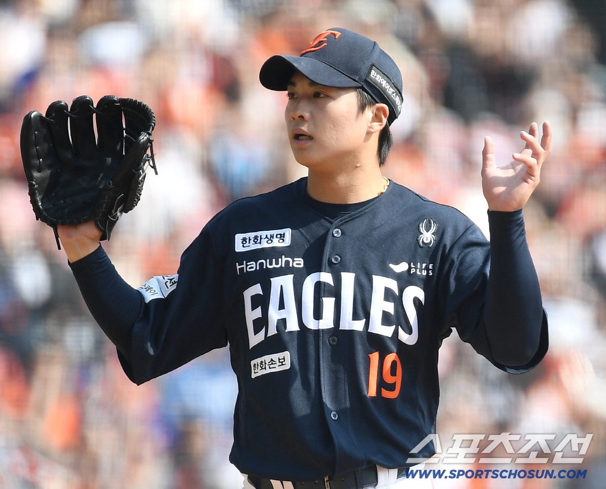 4일 잠실야구장에서 열린 KBO리그 두산과 한화의 경기. 4회말 무사 1루. 정수빈 삼진 후 1루주자 박준순이 2루에서 아웃되며 투아웃이 되자 환호하는 한화 왕옌청. 잠실=송정헌 기자songs@sportschosun.com/2026.04.04/