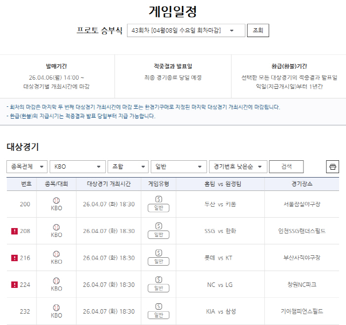 프로토 승부식 43회차는 ▲일반 ▲승1패 ▲핸디캡 ▲언더오버 ▲SUM ▲전반(1~5이닝) 일반 ▲전반 핸디캡 ▲전반 언더오버 등 다양한 게임 유형으로 구성됐다.