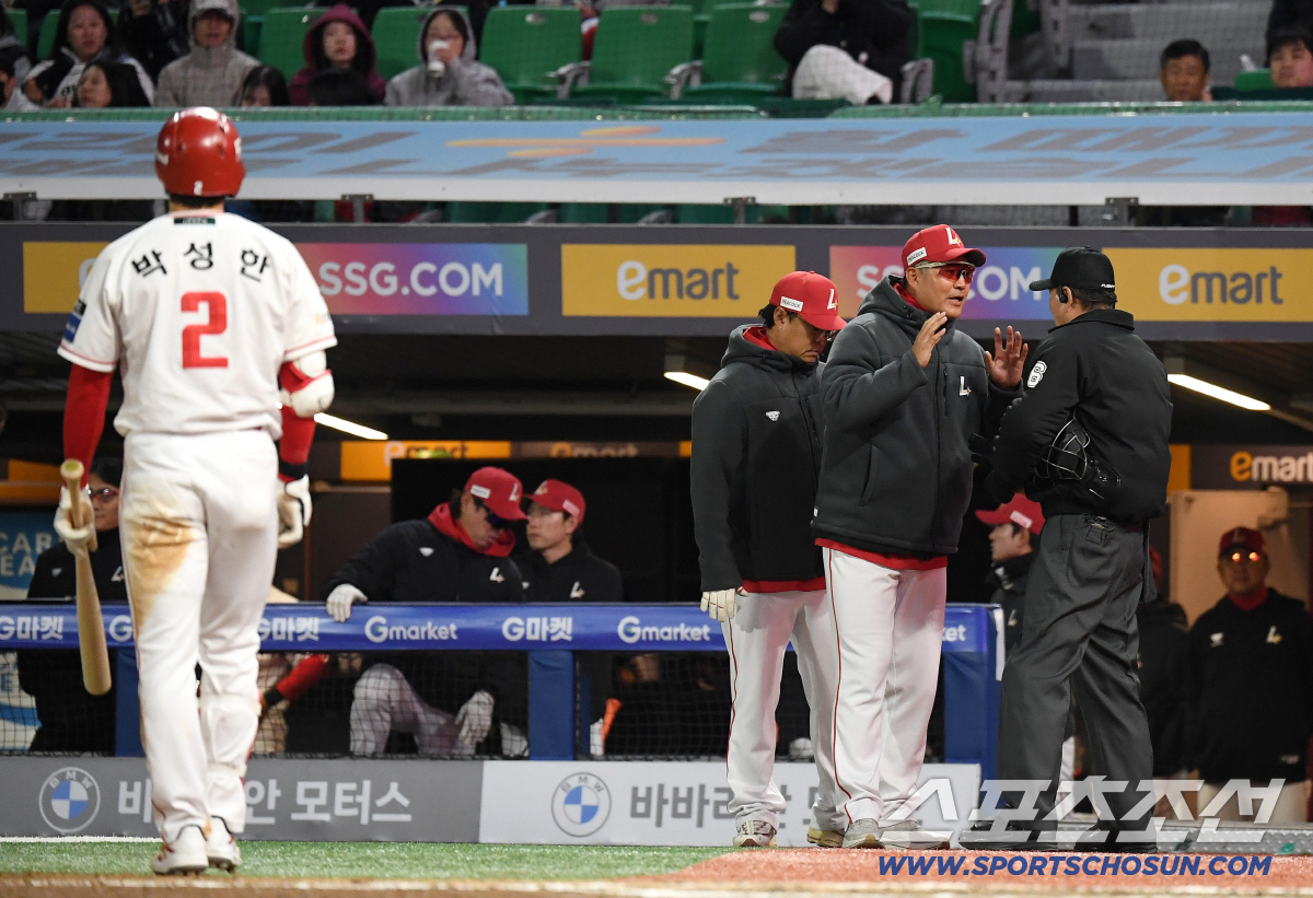 하지만 박성한은 아웃이었다. 수비 방해 판정이 나왔기 때문이다. 이 감독이 곧바로 나와 항의했지만, 달라지는 건 없었다. 타자나 주자가 수비수를 터치하면 수비수쪽에 우선권이 주어진다.