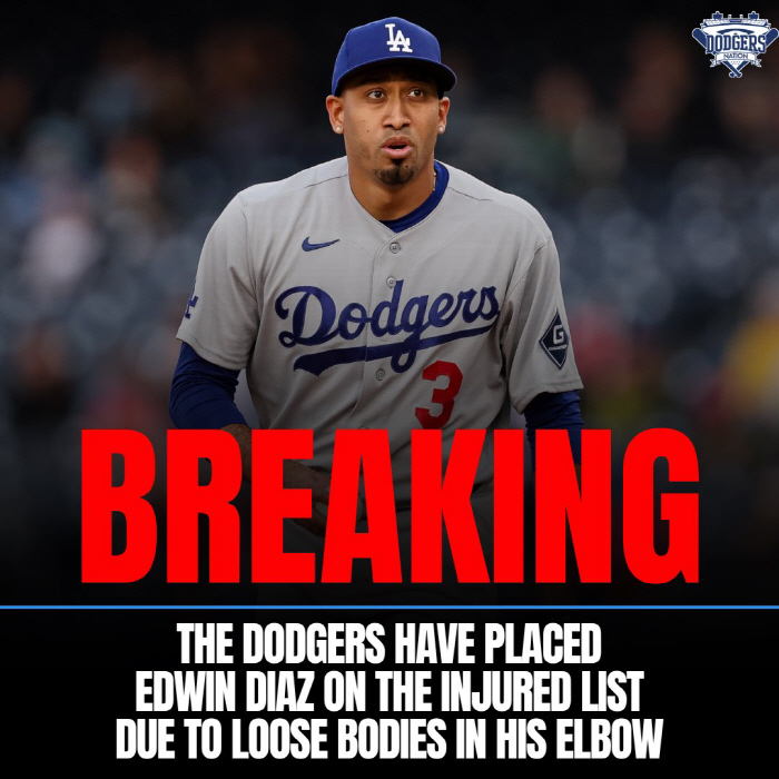 다저스는 21일(한국시각) '디아스가 팔꿈치 내 유리체 제거 수술을 받을 예정'이라고 밝혔다. 디아스는 부상자 명단에 올랐으며 로버츠 감독은 복귀 시점을 구체적으로 언급하지는 못했다. 다저스는 이에 따른 조치로 트리플A 오클라호마시티에서 좌완 투수 제이크 에더를 콜업했다.