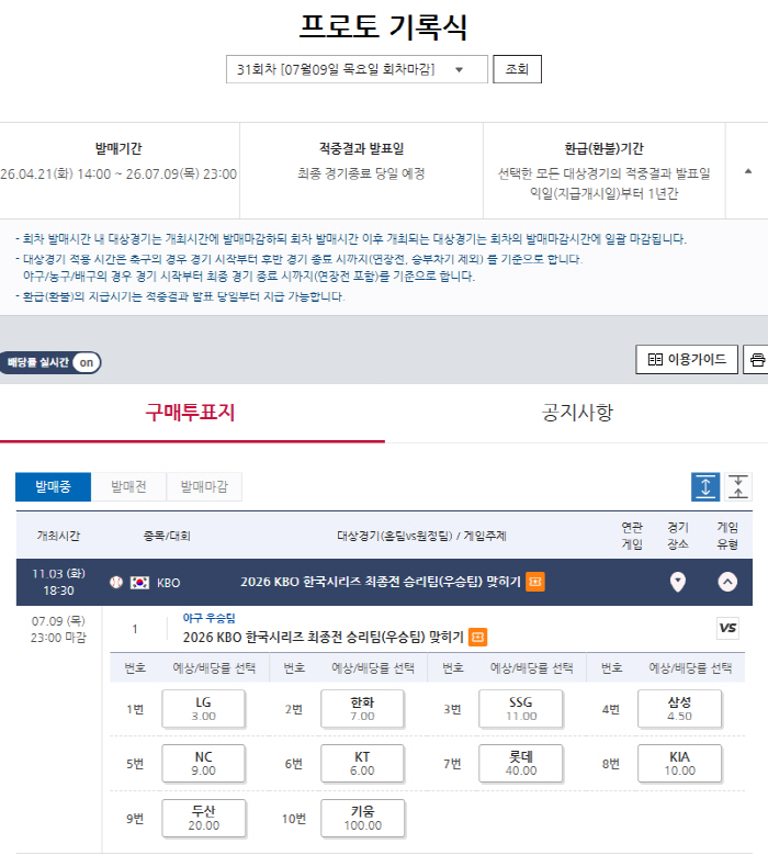 이번 게임은 KBO리그 10개 구단 가운데 한국시리즈 최종전 승리팀을 예상해 선택하는 방식으로 참여할 수 있다. 각 팀의 순서는 2025시즌 최종 순위를 기준으로 구성됐으며, 발매 기간 중 각 팀의 배당률은 운영 상황에 따라 변동될 수 있다.