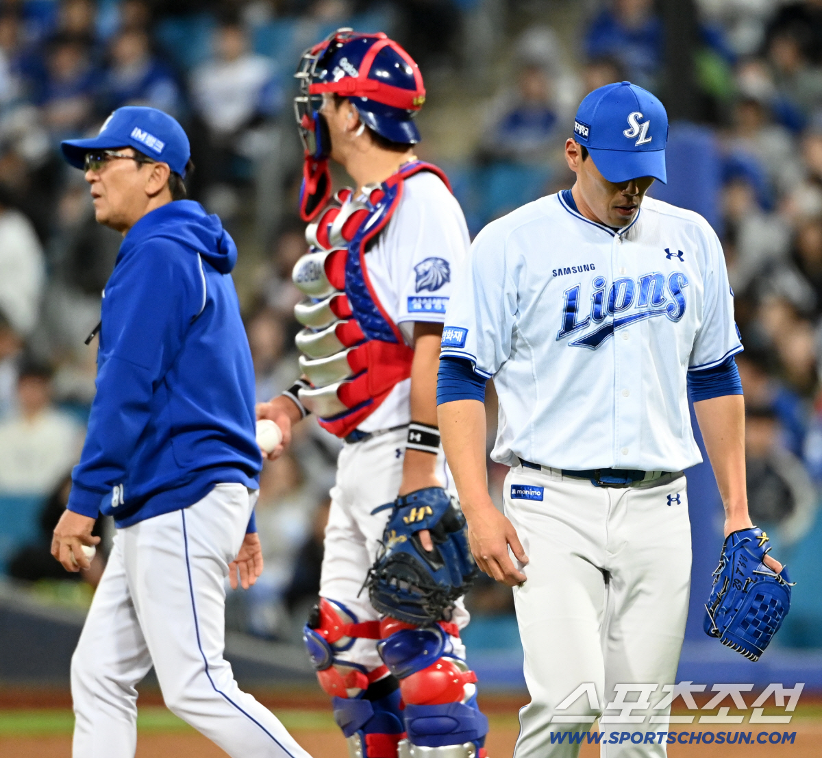 22일 대구삼성라이온즈파크에서 열린 SSG와 삼성의 경기. 9회초 역전을 허용한 김재윤이 마운드를 내려가고 있다. 대구=허상욱 기자wook@sportschosun.com/2026.04.22/