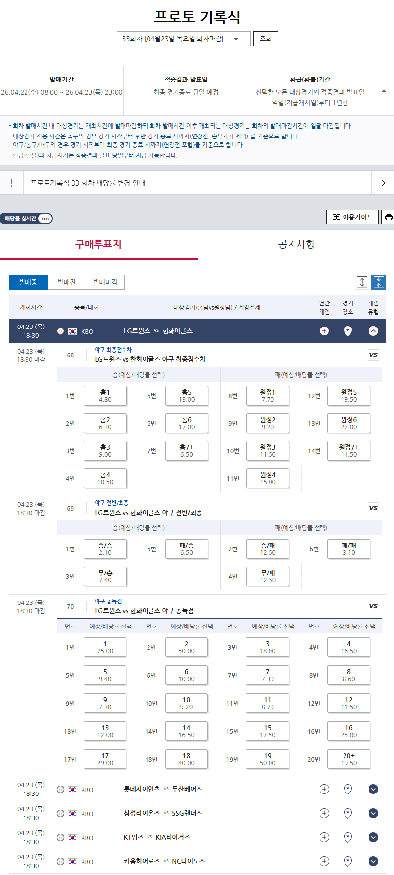 이어 진행되는 프로토 기록식 33회차는 지난 4월 22일(수) 오전 8시에 발매를 개시했으며, 이번 회차에서 KBO리그를 대상으로 하는 게임은 4월 23일(목) 오후 6시 30분까지 전국 판매점 및 베트맨을 통해 구매할 수 있다.