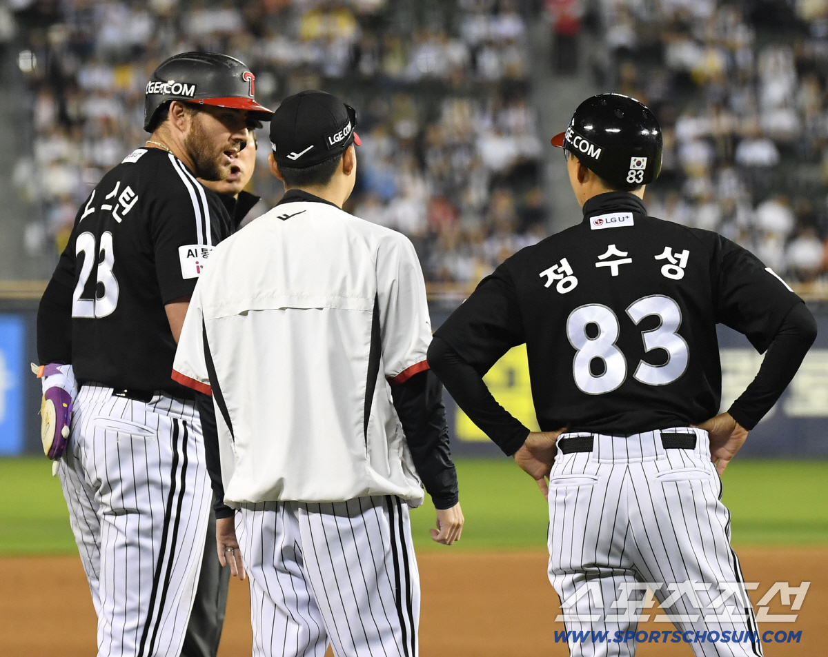 24일 잠실야구장에서 열린 LG와 두산의 경기. 9회초 1사 만루. 문보경 적시타 때 1루에서 3루까지 내달린 오스틴이 정수성 코치의 주루 도움으로 판단. 아웃되고 있다. 잠실=송정헌 기자songs@sportschosun.com/2026.04.24/