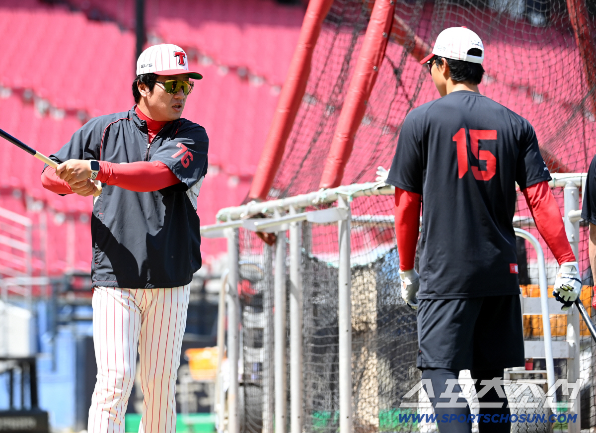 25일 광주KIA챔피언스필드에서 열린 롯데와 KIA의 경기. KIA 김주찬 코치가 박재현의 타격을 지도하고 있다. 광주=허상욱 기자wook@sportschosun.com/2026.04.25/