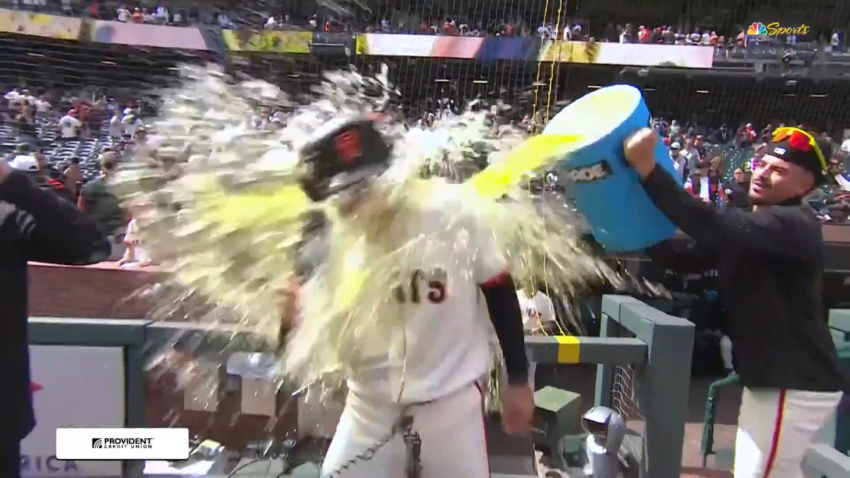 경기 후 방송 인터뷰를 하던 이정후(28·샌프란시스코 자이언츠)의 머리 위로 노란색 파워에이드 폭포가 쏟아졌다. 범인은 이날 휴식 차 결장했던 동료 윌리 아다메스. 흠뻑 젖은 채 환하게 웃어 보인 이정후는 "아다메스가 아주 잘 해줬다"며 특유의 넉살로 승리의 기쁨을 만끽했다. 아다메스는 남은 음료를 이정후의 통역을 맡은 저스틴 한(한국명 한동희)에게까지 퍼부었다.