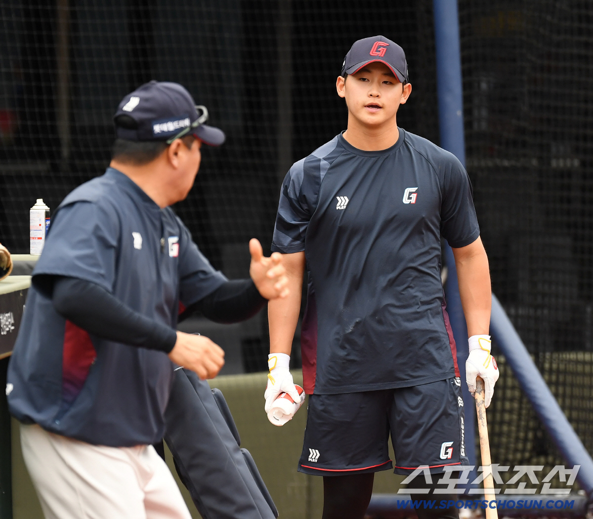 28일 부산 사직야구장에서 열리는 롯데와 키움의 경기. 이서준에게 타격 지도를 하고 있는 롯데 김태형 감독. 부산=송정헌 기자songs@sportschosun.com/2026.04.28/