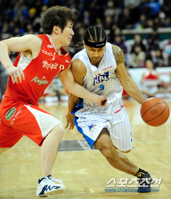 서울 SK와 전주 KCC의 프로농구 경기가 8일 잠실 학생체육관에서 펼쳐 졌다. 전주 KCC 전태풍(오른쪽)의 돌파를 서울 SK 황성인이 밀착 마크하고 있다. 잠실=조병관 기자 rainmaker@sportschosun.com/2012.01.08/ |