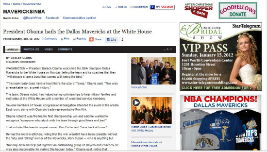 | 오바마 미국 대통령이 NBA 우승팀 댈러스 매버릭스를 백악관으로 초청했다는 사실을 보도한 미국 언론 '스타 텔레그램'의 인터넷판. |