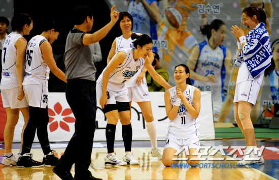 | 15일 부천 실내체육관에서 2011-2012 여자프로농구 올스타전이 열렸다. 동부선발 박정은이 경기 종료 직전 반칙을 얻어내자 기뻐하며 무릎을 꿇고 있다. 부천=정재근 기자 cjg@sportschosun.com/2012.01.15/ |
