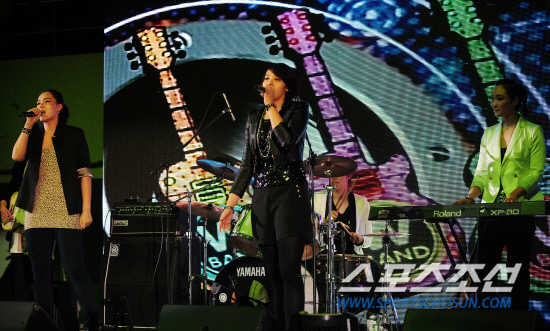 | 15일 부천 실내체육관에서 2011-2012 여자프로농구 올스타전이 열렸다. 하프타임 때 현역 여자농구 선수들로 구성된 록밴드 'W밴드'가 멋진 공연을 펼치고 있다. 부천=정재근 기자 cjg@sportschosun.com/2012.01.15/ |