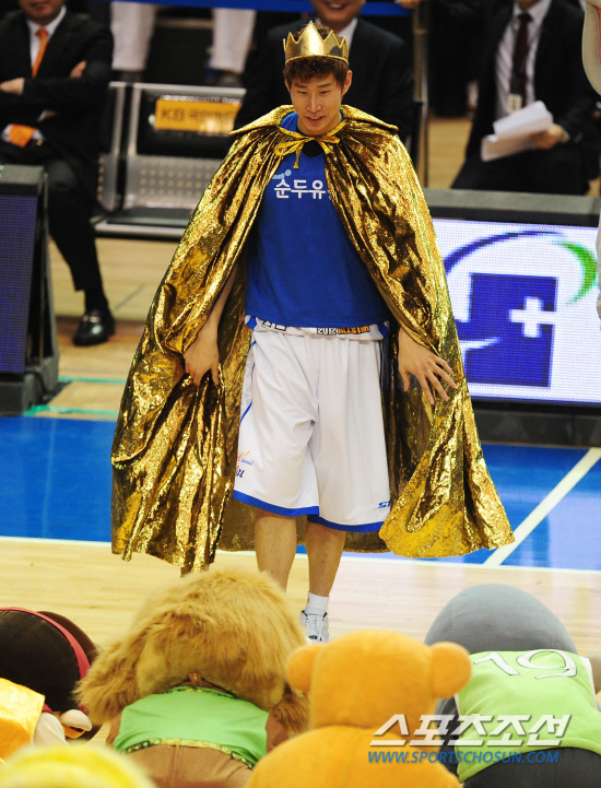 '2012 프로농구 올스타전' 경기가 29일 잠실 실내체육관에서 펼쳐 졌다. 하프타임 이벤트로 열린 일대일 대결에 나선 오세근이 왕자 복장을 하고 동물 마스코트의 절을 받으며 입장하고 있다. 오세근의 별명은 '라이온 킹'이다. 잠실=조병관 기자 rainmaker@sportschosun.com