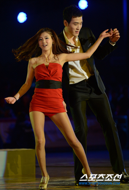29일 서울 잠실실내체육관에서 2011-2012 프로농구 올스타전이 열렸다. 오리온스 김민섭이 치어리더와 함께 '트러블 메이커' 노래에 맞춰 멋진 안무를 펼치고 있다. 잠실실내=정재근 기자 cjg@sportschosun.com