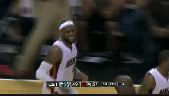 | 마이애미의 르브론 제임스가 31일 뉴올리언스전에서 덩크슛을 성공시킨 뒤 기뻐하고 있다. 사진은 NBA TV 캡처 화면. |