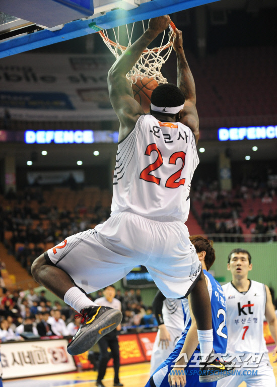 KT 오코사가 한국에 입국한 21일 바로 삼성전에 투입돼 시원한 덩크슛을 터뜨리고 있다. 잠실=조병관 기자 rainmaker@sportschosun.com