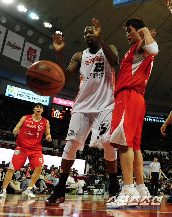 4일 오후 잠실 학생체육관에서 2011-2012 프로농구 서울 SK와 인천 전자랜드의 경기가 열렸다. 전자랜드 힐(왼쪽)과 SK 손준영이 골라인을 벗어나는 볼을 피하고 있다. 잠실=김경민 기자 kyungmin@sportschosun.com