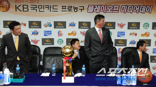 | KCC 허 재 감독과 모비스 유재학 감독이 미디어데이 행사 도중 자리를 비운 KGC 이상범 감독을 찾기 위해 고개를 돌리고 있다. 정재근 기자 cjg@sportschosun.com |