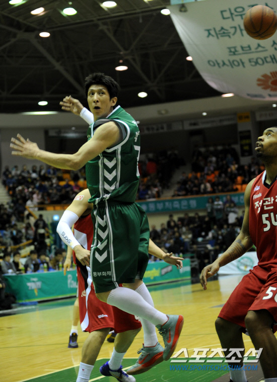 원주 동부와 안양 KGC의 2011-2012 프로농구 챔피언결정전 1차전이 28일 원주치악체육관에서 열렸다. 동부 박지현이 KGC 다니엘스의 수비를 피해 패스를 시도하고 있다. 원주=허상욱 기자 wook@sportschosun.com