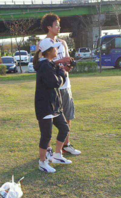 사진에서 유병재 선수는 리모콘으로 장난감 자동차를 조종하고 있고, 바로 옆에는 트레이닝 복에 모자를 착용한 신지가 나란히 서서 그 모습을 바라보고 있다. 키 191cm의 유병재 선수와 165cm의 신지는 머리 하나 이상의 차이가 나는 무려 26cm의 남다른 키 차이로 시선을 모았다.