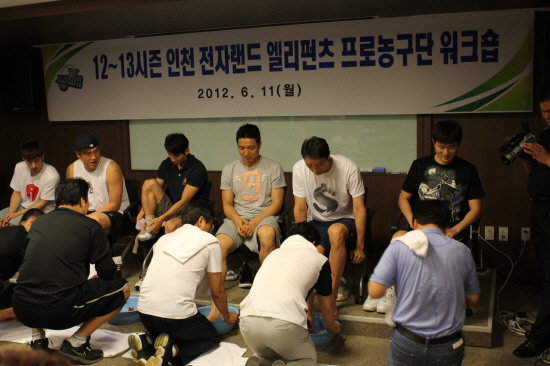 전자랜드 농구단이 최근 설악산 워크숍을 통해 분위기를 쇄신했다. 워크숍 첫날에 선수들의 발을 씻겨주는 세족식 행사가 열리고 있다. 사진=전자랜드 구단 제공