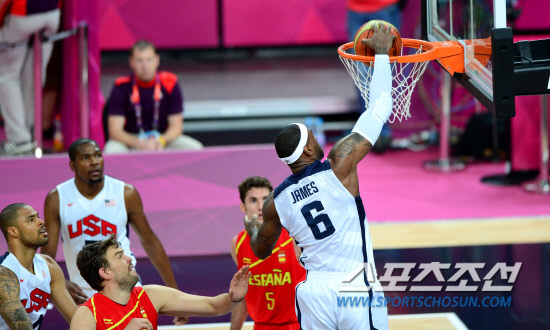 미국 남자 농구대표팀이 12일 런던 노우스 그린위치아레나에서 스페인과 남자농구 결승전을 펼쳤다. 르브론 제임스가 스페인 수비를 제치며 덩크슛을 성공시키고 있다.