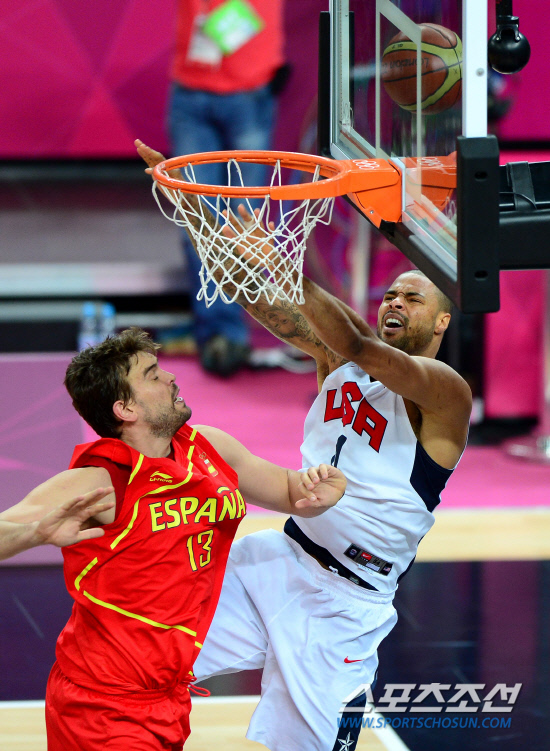 미국 남자 농구대표팀이 12일 런던 노우스 그린위치아레나에서 스페인과 남자농구 결승전을 펼쳤다. 타이슨 챈들러의 슛을 스페인 마크 가솔이 막아서고 있다.