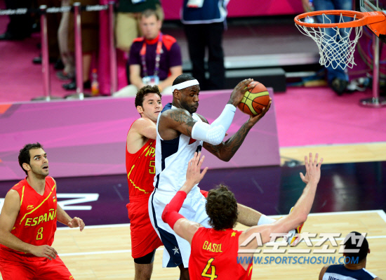 미국 남자 농구대표팀이 12일 런던 노우스 그린위치아레나에서 스페인과 남자농구 결승전을 펼쳤다. 르브론 제임스가 스페인 선수들 사이로 공격 라바운드 볼을 따내고 있다.
