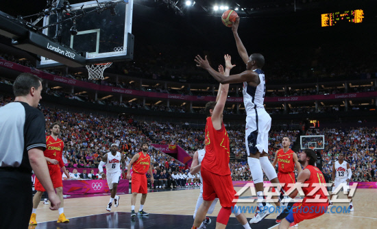런던올림픽 폐막일인 12일 오후(현지시각) 런던 노스 그리니치 아레나에서 열린 남자 농구 결승전에서 미국의 케빈 듀란트가 슛을 시도하고 있다.