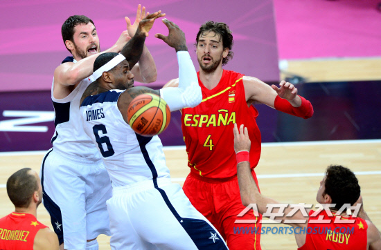 미국 남자 농구대표팀이 12일 런던 노우스 그린위치아레나에서 스페인과 남자농구 결승전을 펼쳤다. 미국 르브론 제임스와 케빈 러브(왼쪽)가 리바운드를 서로 잡으려다 놓치고 있다.