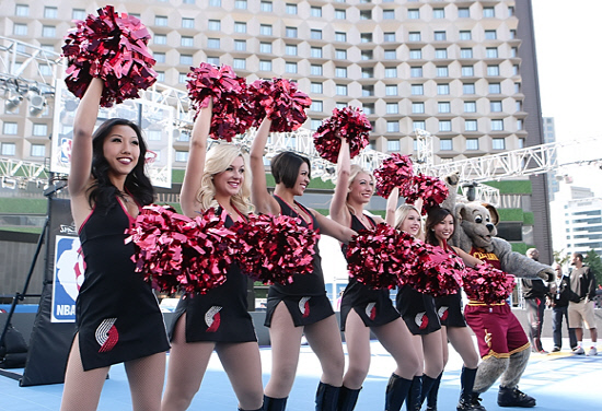 미국프로농구(NBA) 포틀랜드 트레일블레이저스 댄스팀이 12일 오전 서울시청 앞 광장에서 섹시한 의상과 포즈로 싸이의 '강남스타일' 춤을 선보이고 있다. 이들은 국내 처음으로 열리는 '2012 NBA 3X Korea 길거리 농구대회'를 기념해 한국을 찾았다. <스포츠조선닷컴, 사진=스타엔>
