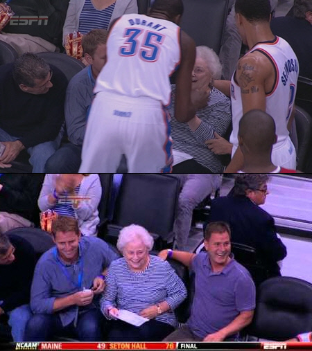듀란트는 곧장 그 팬에게로 달려가 '다친 데가 없냐'고 안부를 묻고 뺨에 가벼운 키스를 날렸다. 뜻하지 않은 일을 당한 할머니 팬은 아들로 보이는 두 남성 관중과 함께 '저런 선수도 있냐는'듯 환하게 웃었다.