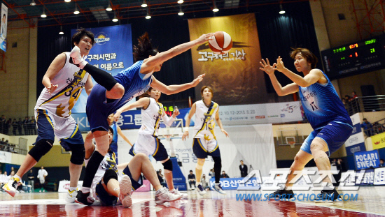 여자프로농구 신한은행과 KDB생명의 경기가 12일 구리 실내체육관에서 펼쳐졌다. 곽주영이 넘어질 듯 김보미에게 패스를 시도하고 있다. 구리=전준엽 기자 noodle@sportschosun.com/2012.11.12/ |