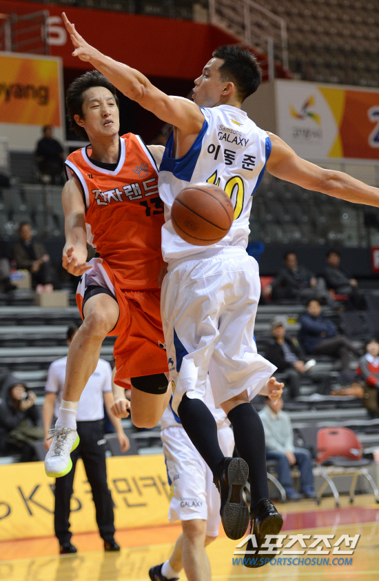 2012 프로-아마 최강전 준결승 인천 전자랜드와 서울 삼성의 경기가 5일 고양실내체육관에서 열렸다. 전자랜드 이한권이 삼성 이동준의 수비를 피해 패스를 시도하고 있다. 고양=허상욱 기자 wook@sportschosun.com/2012.12.05/