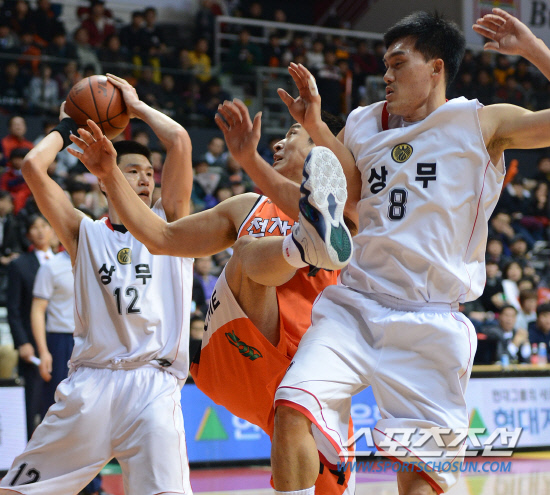 6일 고양실내체육관에서 2012 프로-아마 최강전 상무와 인천 전자랜드의 결승전이 열렸다. 전자랜드 이현호가 상무 윤호영과 차재영 사이에서 리바운드 다툼을 벌였지만 공을 잡는데 실패하고 있다. 고양=정재근 기자 cjg@sportschosun.com/2012.12.06/