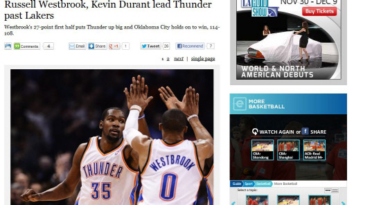 이날 경기는 듀란트-웨스트브룩과 코비 브라이언트-드와이트 하워드(레이커스)의 대결로 관심을 모았다.