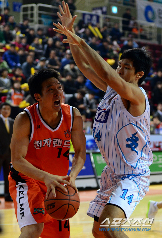 13일 인천삼산실내체육관에서 2012-2013 프로농구 전자랜드와 KCC의 경기가 열렸다. 전자랜드 이현호(왼쪽)가 KCC 노승준의 수비를 앞에 두고 돌파를 시도하고 있다. 인천=송정헌 기자 songs@sportschosun.com