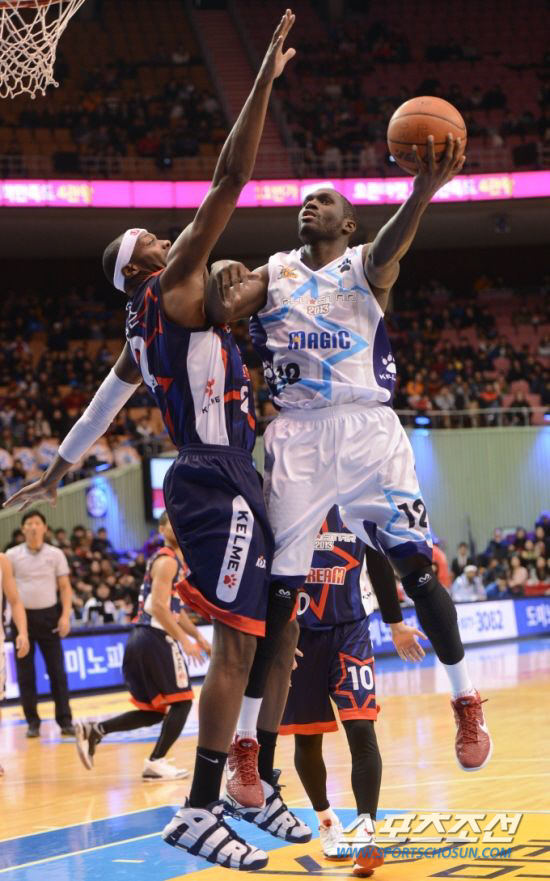 | 지난 27일 올스타전에서 드림팀의 로드 벤슨이 매직팀의 파틸로를 수비하고 있다. 최문영 기자 deer@sportschosun.com |