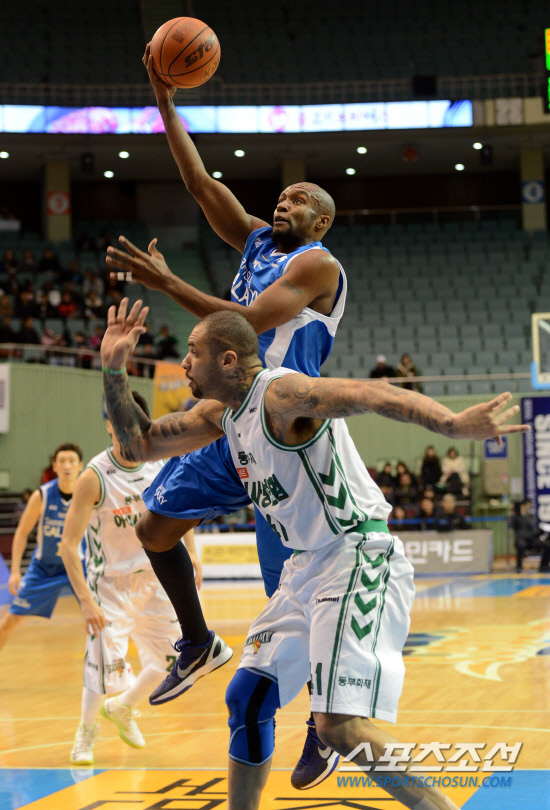 서울 삼성과 원주 동부의 2012-2013 프로농구 경기가 7일 잠실실내체육관에서 열렸다. 삼성 블랭슨이 동부 센슬리의 수비를 피해 골밑슛을 시도하고 있다. 잠실실내=허상욱 기자 wook@sportschosun.com