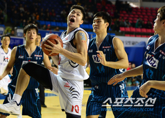 24일 전주실내체육관에서 열린 프로농구 KCC와 KT의 경기에서 KT 조성민이 KCC 선수들 사이에서 공격 리바운드를 잡아내고 있다. 전주=송정헌 기자 songs@sportschosun.com