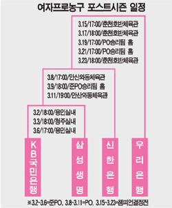 전쟁이 시작된다. 여자 프로농구 포스트시즌이 2일 용인실내체육관에서 열리는 삼성생명과 KB국민은행의 준플레이오프 1차전으로 막을 올린다. 이번 시즌에는 1-4위, 2-3위가 경기를 치러 챔피언결정전에서 맞붙는 방식이 변경돼, 3위 삼성생명과 4위 KB국민은행의 맞대결 승자가 2위 신한은행과 맞붙게 된다. 플레이오프(3전2선승제) 승리팀이 챔피언결정전(5전3선승제)에 선착한 정규시즌 1위 우리은행과 마지막 일전을 벌인다. 과연, 어느팀이 신한은행과 대결할 수 있는 플레이오프행 티켓을 차지할까.
